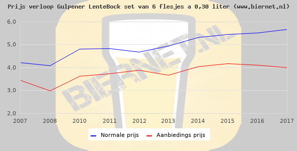 De gemiddelde prijs van een set van 6 flesjes á 0,30 liter van Gulpener LenteBock is niet bekend. De gemiddelde prijs van Gulpener LenteBock in de winkel is niet bekend.