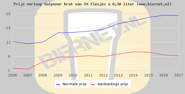 De gemiddelde prijs van een krat van 24 flesjes á 0,30 liter van Gulpener Pilsner is €19,61 (€2,72 per liter). De gemiddelde prijs van Gulpener Pilsner in de winkel is €2,69 per liter.