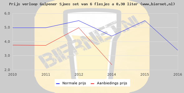 De gemiddelde prijs van een set van 6 flesjes á 0,30 liter van Gulpener Sjoes is niet bekend. De gemiddelde prijs van Gulpener Sjoes in de winkel is niet bekend.