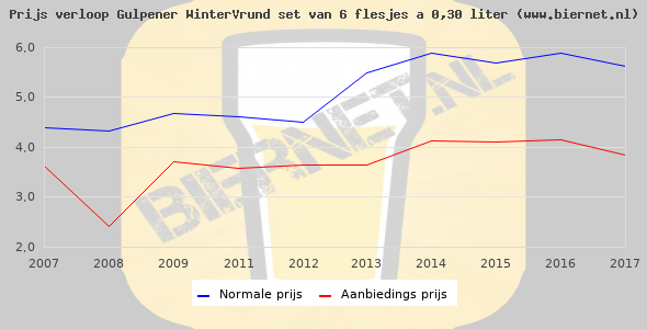 De gemiddelde prijs van een set van 6 flesjes á 0,30 liter van Gulpener WinterVrund is €7,99 (€4,44 per liter). De gemiddelde prijs van Gulpener WinterVrund in de winkel is €4,40 per liter.