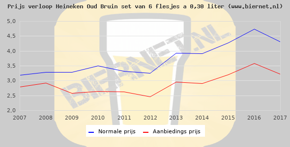 De gemiddelde prijs van een set van 6 flesjes á 0,30 liter van Heineken Oud Bruin is niet bekend. De gemiddelde prijs van Heineken Oud Bruin in de winkel is niet bekend.