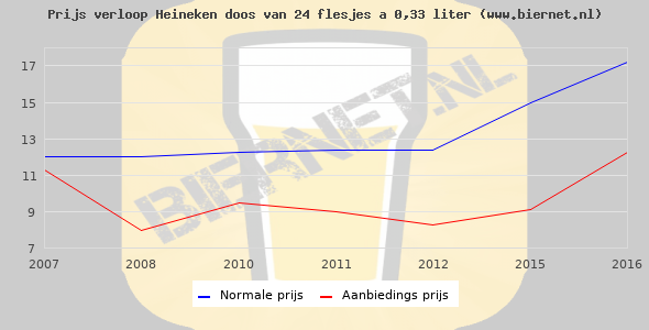 Hieronder staan de standaard prijzen van een Heineken Pilsener doos van 24 flesjes á 0,33 liter. Op dit moment zijn er 26 aanbiedingen van Heineken Pilsener.