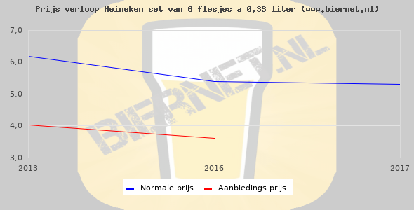 De gemiddelde prijs van een set van 6 flesjes á 0,33 liter van Heineken Pilsener is niet bekend. De gemiddelde prijs van Heineken Pilsener in de winkel is niet bekend.