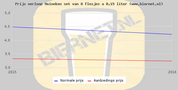 De gemiddelde prijs van een set van 8 flesjes á 0,15 liter van Heineken Pilsener is niet bekend. De gemiddelde prijs van Heineken Pilsener in de winkel is niet bekend.