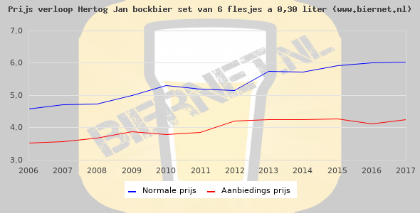 De gemiddelde prijs van een set van 6 flesjes á 0,30 liter van Hertog Jan Bockbier is €7,94 (€4,41 per liter). De gemiddelde prijs van Hertog Jan Bockbier in de winkel is €4,31 per liter.