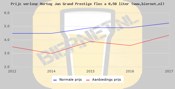 De gemiddelde prijs van een fles á 0,50 liter van Hertog Jan Grand Prestige is €7,28 (€14,56 per liter). De gemiddelde prijs van Hertog Jan Grand Prestige in de winkel is €6,08 per liter.