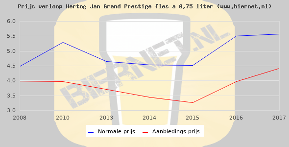 De gemiddelde prijs van een fles á 0,75 liter van Hertog Jan Grand Prestige is €7,31 (€9,75 per liter). De gemiddelde prijs van Hertog Jan Grand Prestige in de winkel is €6,38 per liter.