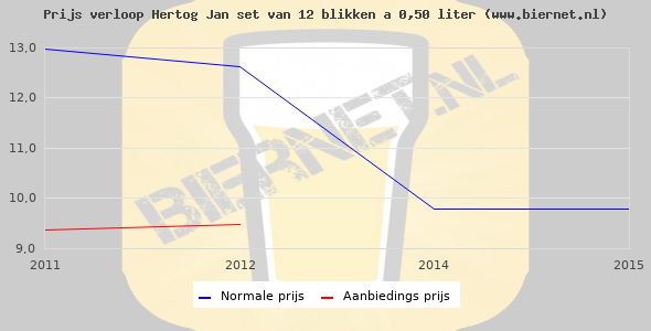 De gemiddelde prijs van een set van 12 blikken á 0,50 liter van Hertog Jan Pilsener is niet bekend. De gemiddelde prijs van Hertog Jan Pilsener in de winkel is niet bekend.
