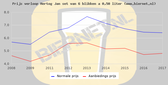 De gemiddelde prijs van een set van 6 blikken á 0,50 liter van Hertog Jan Pilsener is €9,22 (€3,07 per liter). De gemiddelde prijs van Hertog Jan Pilsener in de winkel is €3,00 per liter.