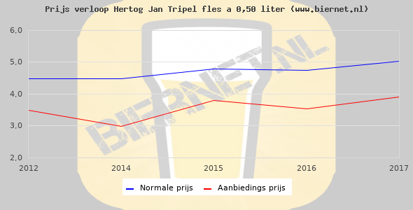 De gemiddelde prijs van een fles á 0,50 liter van Hertog Jan Tripel is €9,1 (€18,2 per liter). De gemiddelde prijs van Hertog Jan Tripel in de winkel is €5,88 per liter.