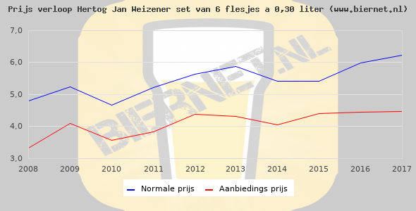 De gemiddelde prijs van een set van 6 flesjes á 0,30 liter van Hertog Jan Weizener is €7,55 (€4,19 per liter). De gemiddelde prijs van Hertog Jan Weizener in de winkel is €4,19 per liter.
