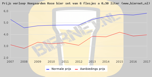 De gemiddelde prijs van een set van 6 flesjes á 0,30 liter van Hoegaarden Rose bier is €6,99 (€3,88 per liter). De gemiddelde prijs van Hoegaarden Rose bier in de winkel is €4,86 per liter.