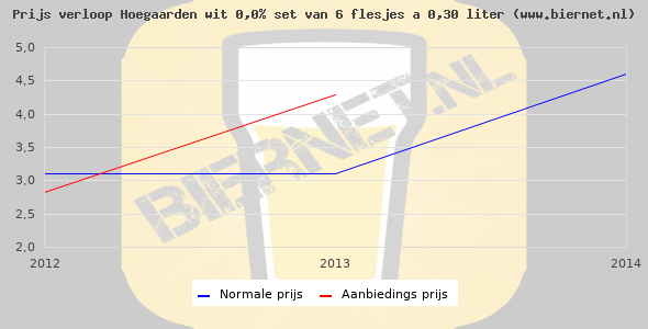 De gemiddelde prijs van een set van 6 flesjes á 0,30 liter van Hoegaarden wit 0,0% is niet bekend. De gemiddelde prijs van Hoegaarden wit 0,0% in de winkel is niet bekend.