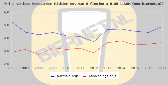 De gemiddelde prijs van een set van 6 flesjes á 0,30 liter van Hoegaarden Witbier is €7,19 (€3,99 per liter). De gemiddelde prijs van Hoegaarden Witbier in de winkel is €3,93 per liter.