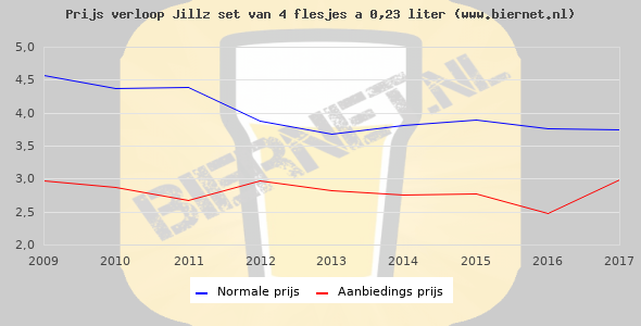 De gemiddelde prijs van een set van 4 flesjes á 0,23 liter van Jillz is niet bekend. De gemiddelde prijs van Jillz in de winkel is niet bekend.