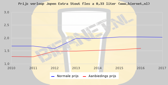 De gemiddelde prijs van een fles á 0,33 liter van Jopen Extra Stout is niet bekend. De gemiddelde prijs van Jopen Extra Stout in de winkel is niet bekend.