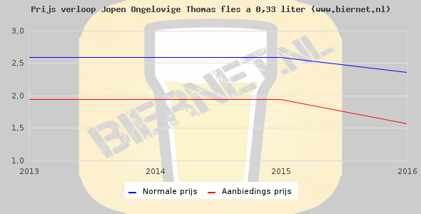 De gemiddelde prijs van een fles á 0,33 liter van Jopen Ongelovige Thomas is €3,04 (€9,21 per liter). De gemiddelde prijs van Jopen Ongelovige Thomas in de winkel is €9,39 per liter.