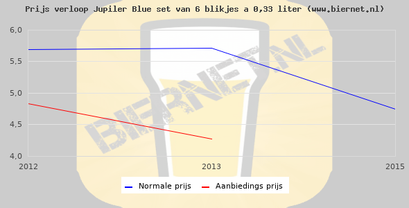 De gemiddelde prijs van een set van 6 blikjes 0,33 liter van Jupiler Blue is niet bekend. De gemiddelde prijs van Jupiler Blue in de winkel is niet bekend.
