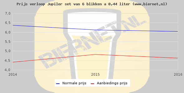 De gemiddelde prijs van een set van 6 blikken á 0,44 liter van Jupiler Pils is €9,99 (€3,78 per liter). De gemiddelde prijs van Jupiler Pils in de winkel is €3,47 per liter.