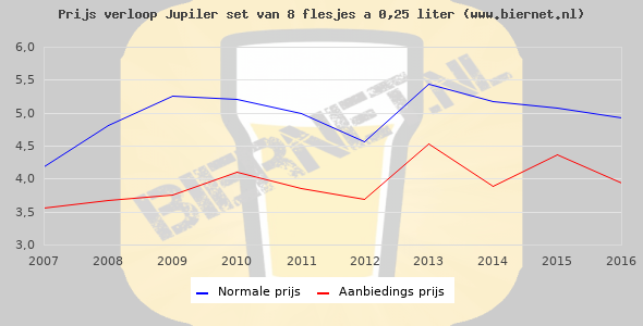 De gemiddelde prijs van een set van 8 flesjes á 0,25 liter van Jupiler Pils is niet bekend. De gemiddelde prijs van Jupiler Pils in de winkel is niet bekend.