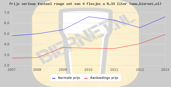 De gemiddelde prijs van een set van 4 flesjes á 0,33 liter van Kasteel Rouge is niet bekend. De gemiddelde prijs van Kasteel Rouge in de winkel is niet bekend.