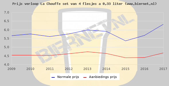 De gemiddelde prijs van een set van 4 flesjes á 0,33 liter van La Chouffe is €8,78 (€6,65 per liter). De gemiddelde prijs van La Chouffe in de winkel is €7,82 per liter.