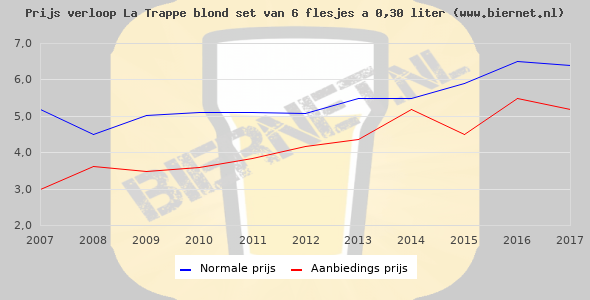 De gemiddelde prijs van een set van 6 flesjes á 0,30 liter van La Trappe Blond is niet bekend. De gemiddelde prijs van La Trappe Blond in de winkel is niet bekend.