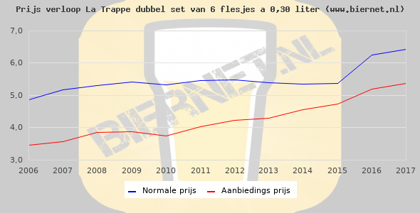 De gemiddelde prijs van een set van 6 flesjes á 0,30 liter van La Trappe Dubbel is niet bekend. De gemiddelde prijs van La Trappe Dubbel in de winkel is niet bekend.