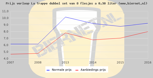 De gemiddelde prijs van een set van 8 flesjes á 0,30 liter van La Trappe Dubbel is niet bekend. De gemiddelde prijs van La Trappe Dubbel in de winkel is niet bekend.