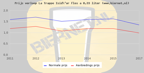 De gemiddelde prijs van een fles á 0,33 liter van La Trappe Isid'or is €2,19 (€6,64 per liter). De gemiddelde prijs van La Trappe Isid'or in de winkel is €6,97 per liter.