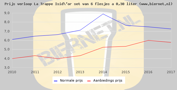 De gemiddelde prijs van een set van 6 flesjes á 0,30 liter van La Trappe Isid'or is niet bekend. De gemiddelde prijs van La Trappe Isid'or in de winkel is niet bekend.