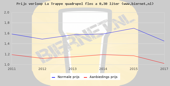 De gemiddelde prijs van een fles á 0,33 liter van La Trappe Quadrupel is €2,44 (€7,39 per liter). De gemiddelde prijs van La Trappe Quadrupel in de winkel is €7,80 per liter.