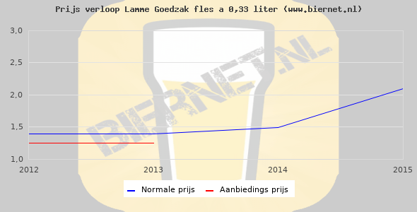 De gemiddelde prijs van een fles á 0,33 liter van Lamme Goedzak is €2,78 (€8,42 per liter). De gemiddelde prijs van Lamme Goedzak in de winkel is €8,42 per liter.