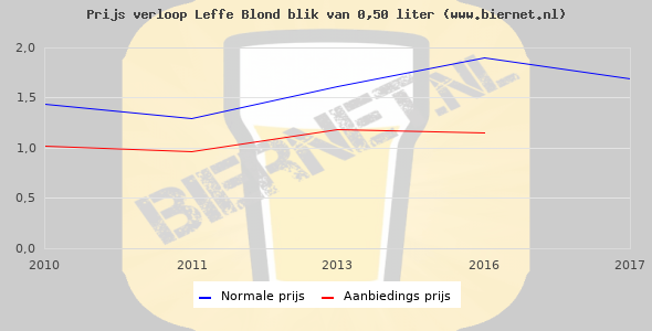 De gemiddelde prijs van een blik van 0,50 liter van Leffe Blond is €2,2 (€4,4 per liter). De gemiddelde prijs van Leffe Blond in de winkel is €4,67 per liter.