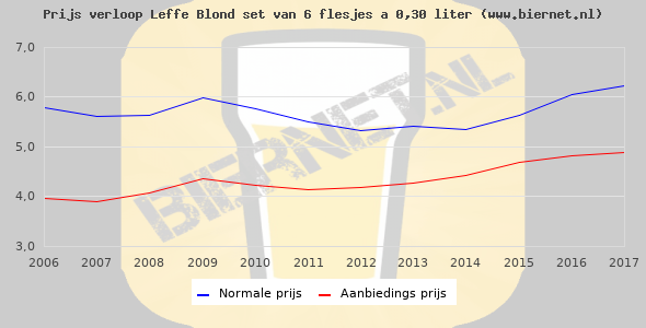 De gemiddelde prijs van een set van 6 flesjes á 0,30 liter van Leffe Blond is €8,44 (€4,69 per liter). De gemiddelde prijs van Leffe Blond in de winkel is €4,60 per liter.
