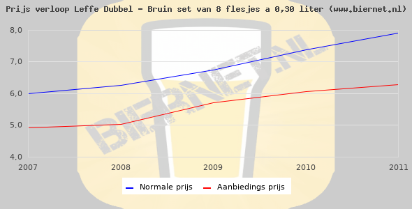 De gemiddelde prijs van een set van 8 flesjes á 0,30 liter van Leffe Bruin is niet bekend. De gemiddelde prijs van Leffe Bruin in de winkel is niet bekend.