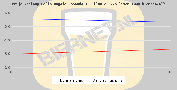 De gemiddelde prijs van een fles á 0,75 liter van Leffe Royale Cascade IPA is niet bekend. De gemiddelde prijs van Leffe Royale Cascade IPA in de winkel is niet bekend.
