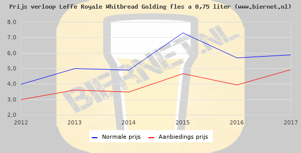 De gemiddelde prijs van een fles á 0,75 liter van Leffe Royale Whitbread Golding is niet bekend. De gemiddelde prijs van Leffe Royale Whitbread Golding in de winkel is niet bekend.