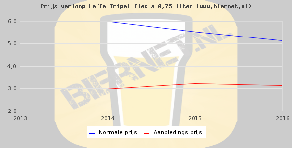 De gemiddelde prijs van een fles á 0,75 liter van Leffe Tripel is €9,95 (€13,27 per liter). De gemiddelde prijs van Leffe Tripel in de winkel is €5,51 per liter.