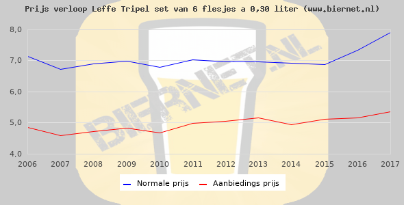 De gemiddelde prijs van een set van 6 flesjes á 0,30 liter van Leffe Tripel is €9,44 (€5,24 per liter). De gemiddelde prijs van Leffe Tripel in de winkel is €5,48 per liter.