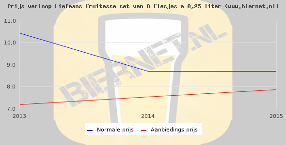 De gemiddelde prijs van een set van 8 flesjes á 0,25 liter van Liefmans fruitesse is niet bekend. De gemiddelde prijs van Liefmans fruitesse in de winkel is niet bekend.