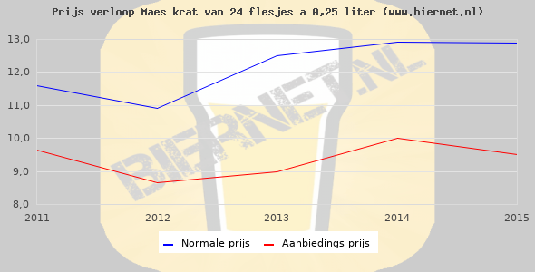 De gemiddelde prijs van een krat van 24 flesjes á 0,25 liter van Maes Pils is niet bekend. De gemiddelde prijs van Maes Pils in de winkel is niet bekend.