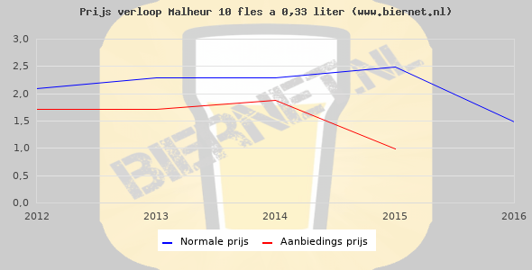De gemiddelde prijs van een fles á 0,33 liter van Malheur 10 is €3,28 (€9,94 per liter). De gemiddelde prijs van Malheur 10 in de winkel is €9,94 per liter.