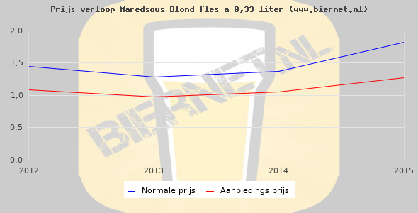 De gemiddelde prijs van een fles á 0,33 liter van Maredsous Blond is €2,24 (€6,79 per liter). De gemiddelde prijs van Maredsous Blond in de winkel is €6,94 per liter.