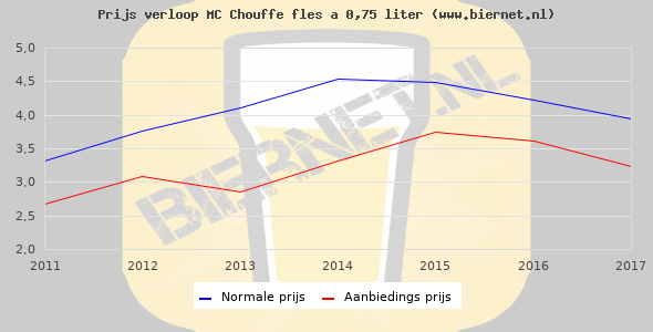 De gemiddelde prijs van een fles á 0,75 liter van MC Chouffe is €6,19 (€8,25 per liter). De gemiddelde prijs van MC Chouffe in de winkel is €8,08 per liter.