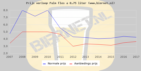 De gemiddelde prijs van een fles á 0,75 liter van Palm Spéciale is niet bekend. De gemiddelde prijs van Palm Spéciale in de winkel is niet bekend.