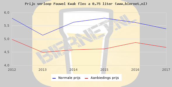 De gemiddelde prijs van een fles á 0,75 liter van Pauwel Kwak is €7,56 (€10,08 per liter). De gemiddelde prijs van Pauwel Kwak in de winkel is €7,13 per liter.