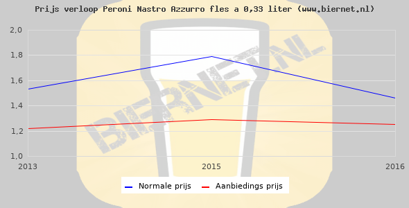 De gemiddelde prijs van een fles á 0,33 liter van Peroni Nastro Azzurro is €1,24 (€3,76 per liter). De gemiddelde prijs van Peroni Nastro Azzurro in de winkel is €3,42 per liter.