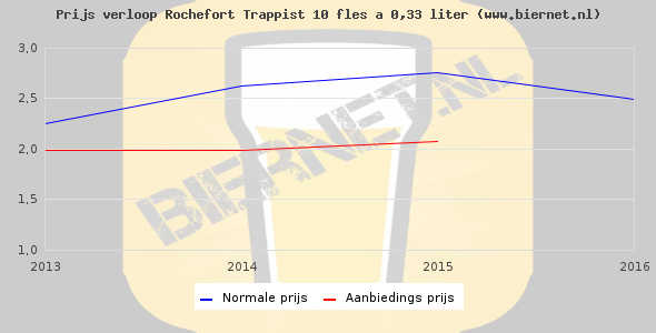 De gemiddelde prijs van een fles á 0,33 liter van Rochefort Trappist 10 is €3,53 (€10,7 per liter). De gemiddelde prijs van Rochefort Trappist 10 in de winkel is €10,70 per liter.