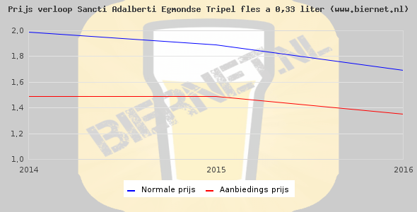De gemiddelde prijs van een fles á 0,33 liter van Sancti Adalberti Egmondse Tripel is €2,94 (€8,91 per liter). De gemiddelde prijs van Sancti Adalberti Egmondse Tripel in de winkel is €8,85 per liter.
